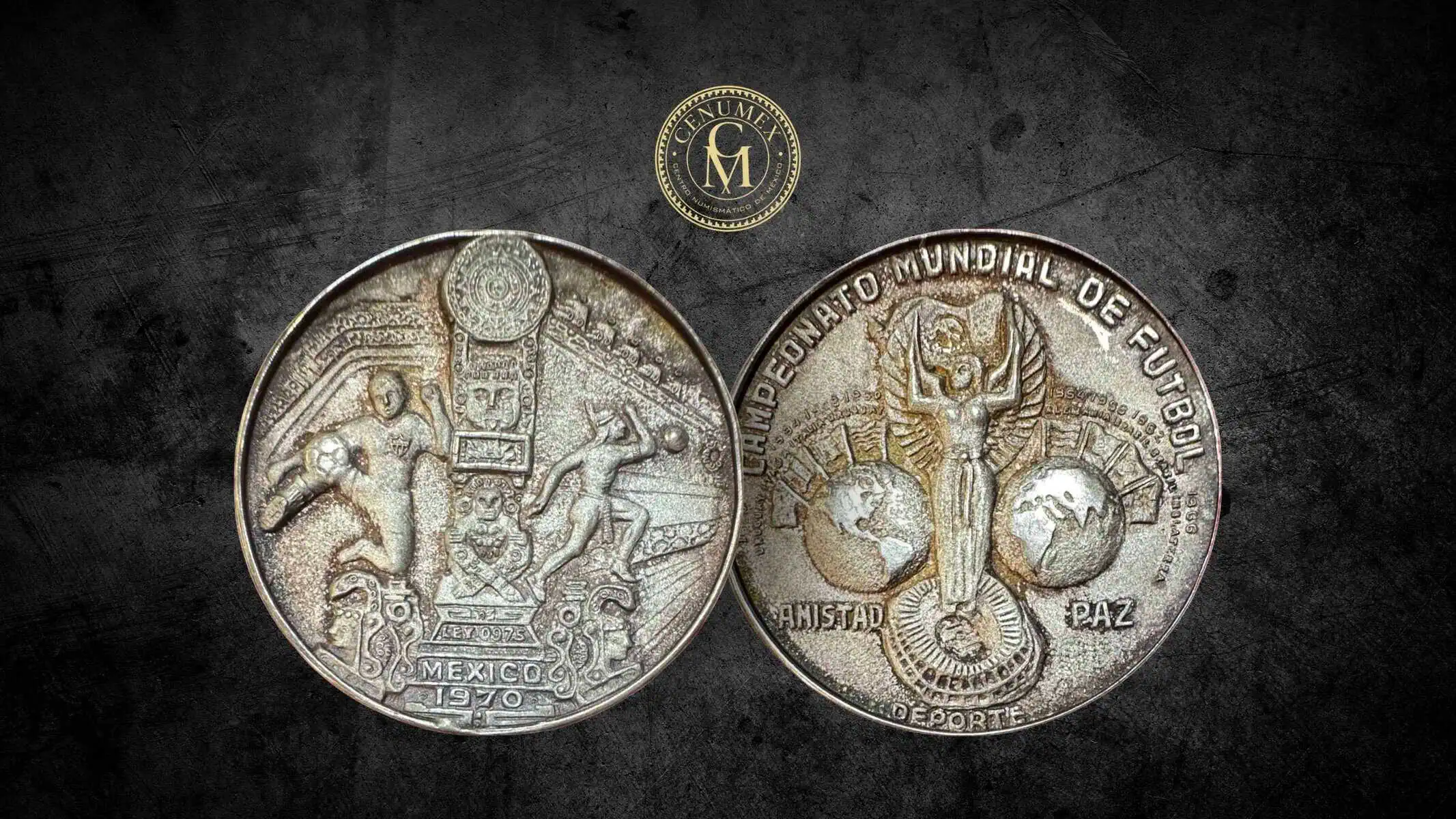 La copa mundial celebrada en México en el año de 1970 tuvo varios diseños, los cuales pueden dividirse en dos: 1) los realizados para conmemorar la celebración mundialista y 2) las medallas deportivas hechas con los nombres y escudos de cada selección de futbol participante. Encontramos con la segunda categoría un diseño con el logotipo de México 70, un balón sobre el logo y la leyenda “IX Campeonato Mundial de Futbol” todo ello en el anverso. Por el anverso se encuentra el nombre de cada país participante y encima el escudo de la federación de futbol correspondiente. El material es aluminio y su diámetro generalmente se encuentra entre los 26 milímetros.