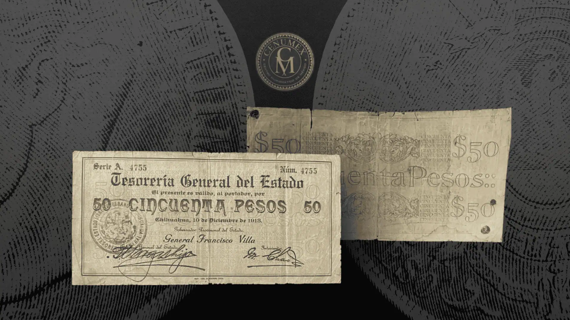 Ahora, todo ello se aprecia en algunos billetes de inicios del siglo XX, especialmente en los billetes revolucionarios. En el anterior ejemplo, aparece un billete de 50 pesitos hecho en 1913 en el estado de Chihuahua. En este tiempo, Francisco Villa era gobernador del estado e imprimió este tipo de billetes con el fin de que la economía saliera a flote. También, funcionaban como pago al ejército que comandaba. Cabe decir que estas piezas fueron mal aceptadas por los comercios locales. Si no fuese por las amenazas de Villa, los billetes hubieran sido inutilizados. Ahora, los elementos art nouveau son pocos, pero muy llamativos. En primer lugar, la tipografía de “50 Cincuenta Pesos 50”. Esta tipografía, alargada en sus puntas, orgánica y con toques sutiles, pero efectivos de color, recuerda a los carteles de antaño. Por la parte de atrás, unas hojas de acanto acompañan al diseño.