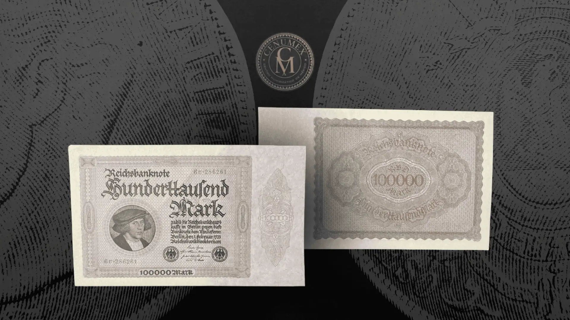 Un gran ejemplo de la tipografía gótica se encuentra en el siguiente billete alemán. Este ejemplar fue hecho en 1923 y tiene un valor de 1000 marcos alemanes. En uno de los extremos del billete se aprecia un retrato del artista Hans Holbein. Esta es la pintura de un comerciante acaudalado y uno de los cuadros más famosos del artista. Alrededor y en la parte de atrás se observan diseños decorativos que recuerdan a la arquitectura y mueblería gótica. Pero, lo que más llama la atención es la tipografía, que no concede ninguna simplicidad de lectura, sino que es fiel a un diseño bien complejo. Un dato curioso de este billete es que pertenece a una época en Alemania donde se imprimieron billetes para pagar los gastos de las naciones que “ganaron” la Primera Guerra Mundial. Con ello, y la inflación que ya de por sí era abultada, el marco se fue a pique, teniendo que imprimir billetes de hasta 5 y 20 billones. Sí, ¡20 Billones de Marcos Alemanes!