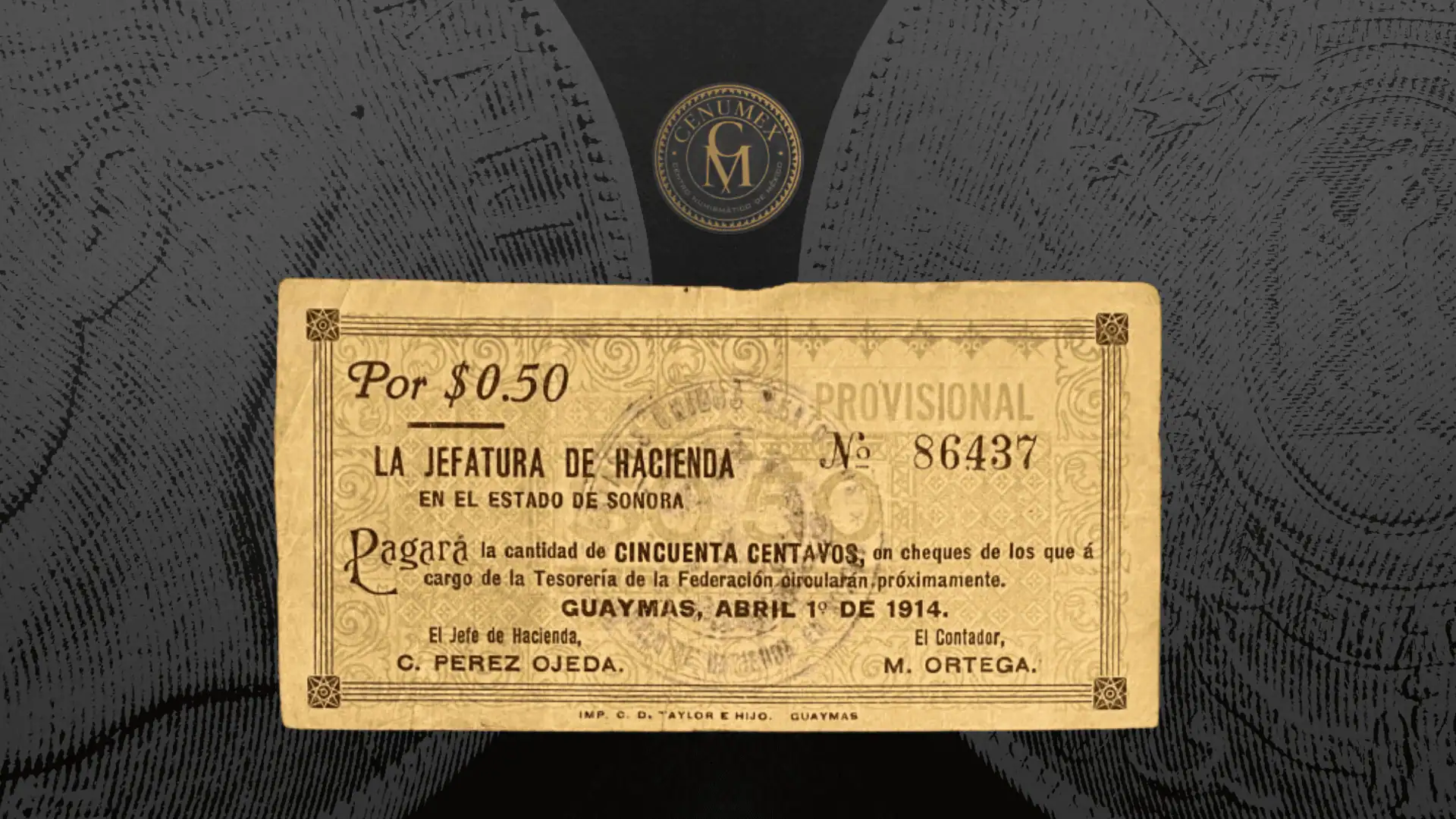 Esto mismo sucede con el siguiente billete de 50 centavos producido en Sonora. Se mezclan elementos decorativos del art nouveau, flores, hojas de acanto y una tipografía orgánica y muy elegante, en la frase “Pagará”, con otros más elementos más serios y rectos. Aquí, a diferencia del billete anterior, no será la combinación con el gótico, sino con columnas rectangulares y estrellas simétricas y con “mucha geometría”. Este billete, resta decir, está producido en Guaymas, Sonora. Tiene una pequeña leyenda en la cual busca transmitir confianza al público: si aceptas este billete, se te será devuelta esa cantidad “próximamente” en forma de moneda. Este no fue un truco nuevo, sino una práctica común en una época faltante de moneda y de circulación del dinero.