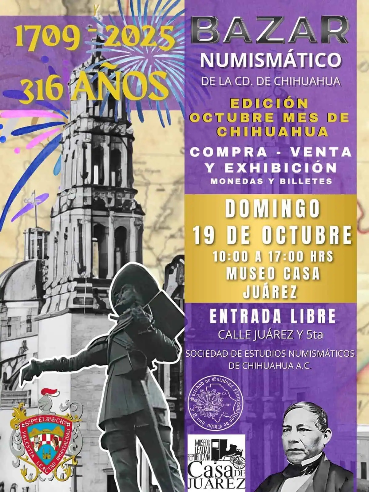 Bazar Numismático de Chihuahua. Edición de octubre, mes de Chihuahua en sus 316 años de existencia. Compra, venta y exhibición de Monedas y Billetes. Entrada Libre.