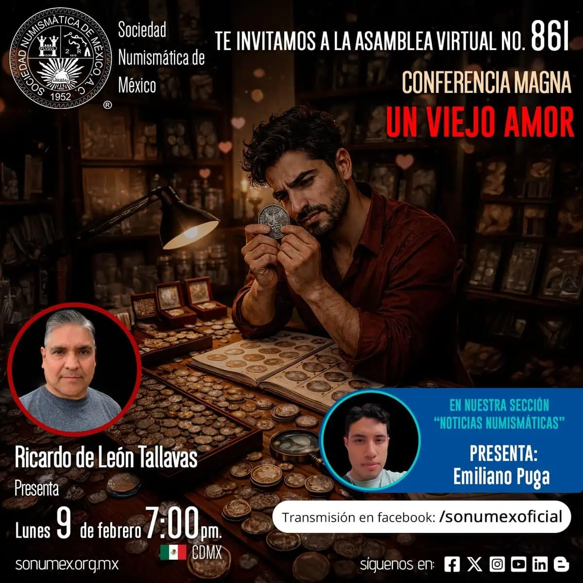 La Sociedad Numismática de México invita a su Asamblea Virtual No. 861, con la conferencia magna: “Un viejo amor”, a cargo de: Ricardo de León Tallavas.