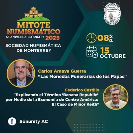 Ciclo de Conferencias “Mitote Numismático” organizado por la Sociedad Numismática de Monterrey del 15 al 17 de octubre de 2025.