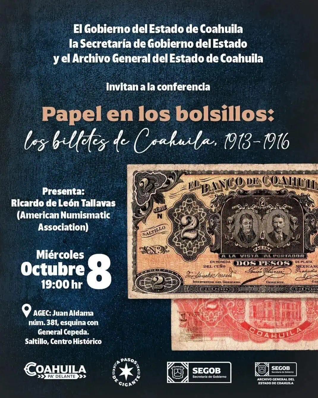 Conferencia “Papel en los Bolsillos: los Billetes de Coahuila (1913-1916)”, que se presentará en el Archivo General del Estado de Coahuila y tendrá como ponente principal a Ricardo de León Tallavas.