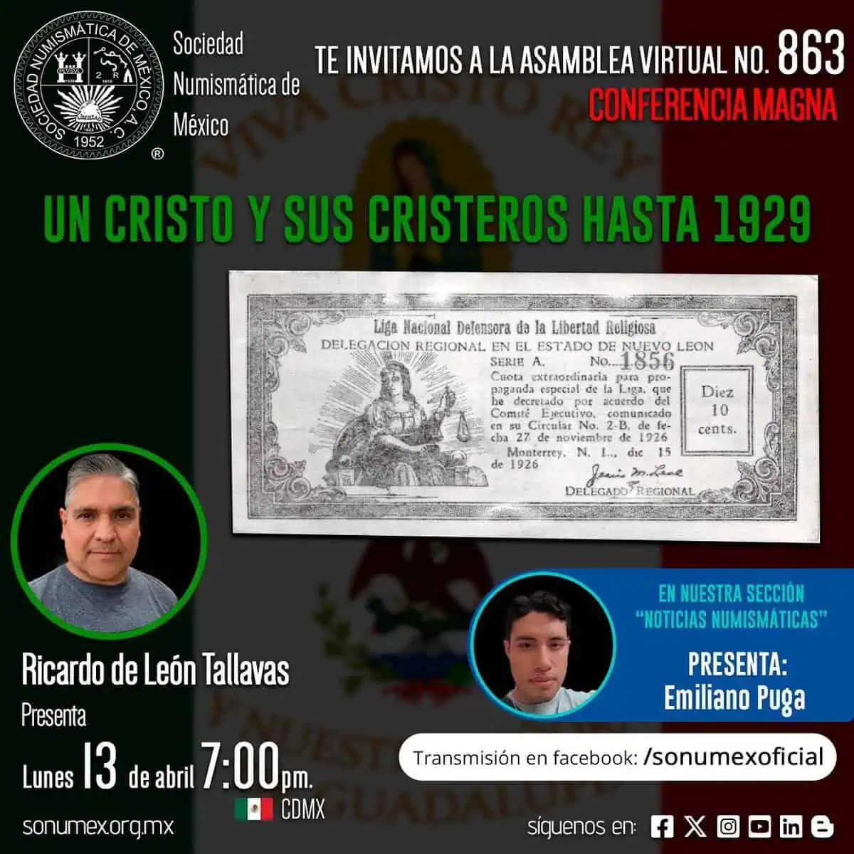 La Sociedad Numismática de México invita a la conferencia “Un Cristo y sus Cristeros hasta 1929”, a cargo de Ricardo de León Tallavas, como parte de su Asambles Virtual No. 863.