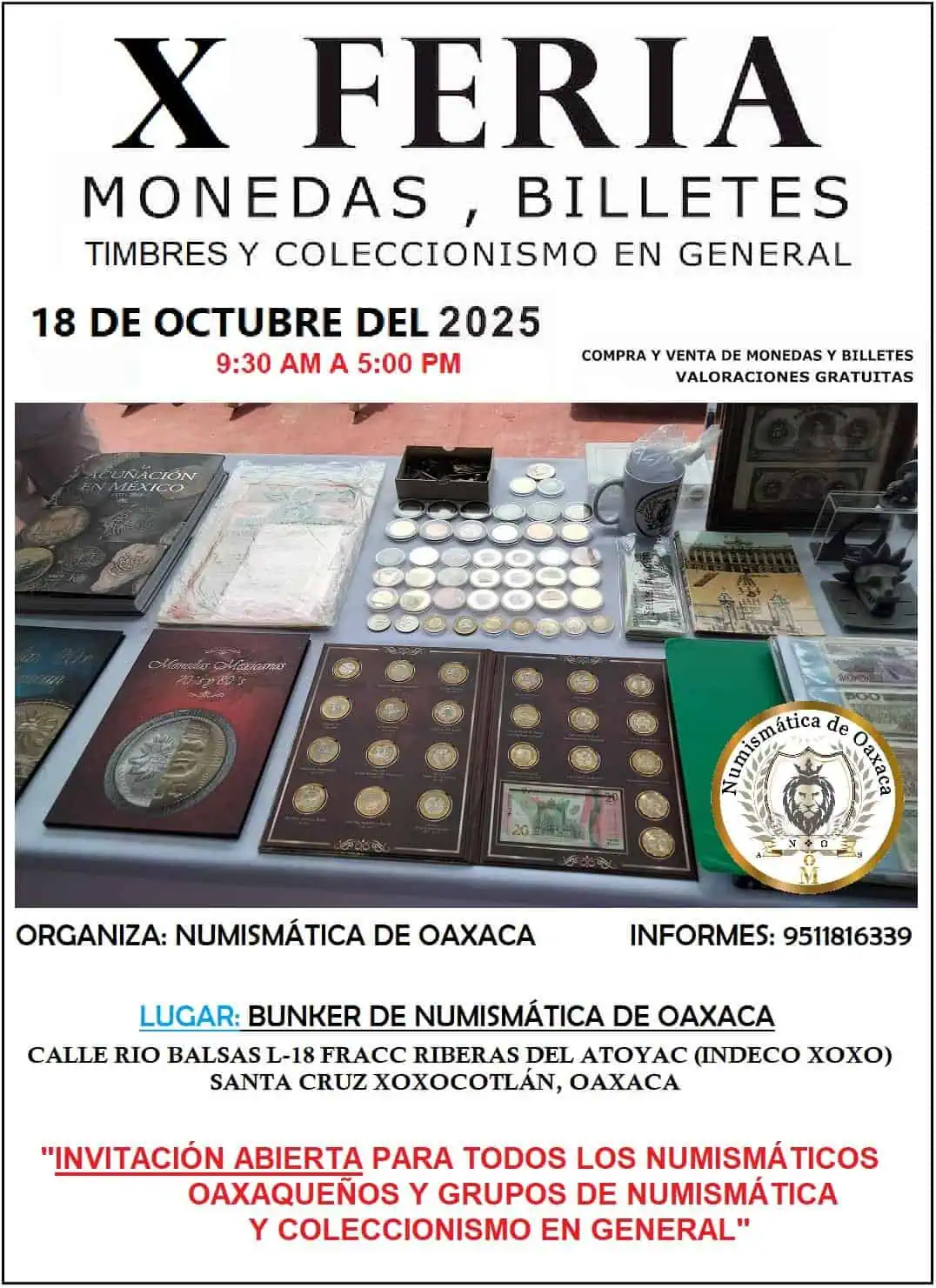 Compra y venta de Monedas, Billetes y Medallas. Además, se realizará la subasta XIV de Briggs & Bustos y se presentará el libro "Mexican Paper Money", edición 2025, de Cory Frampton y Alberto Hidalgo.