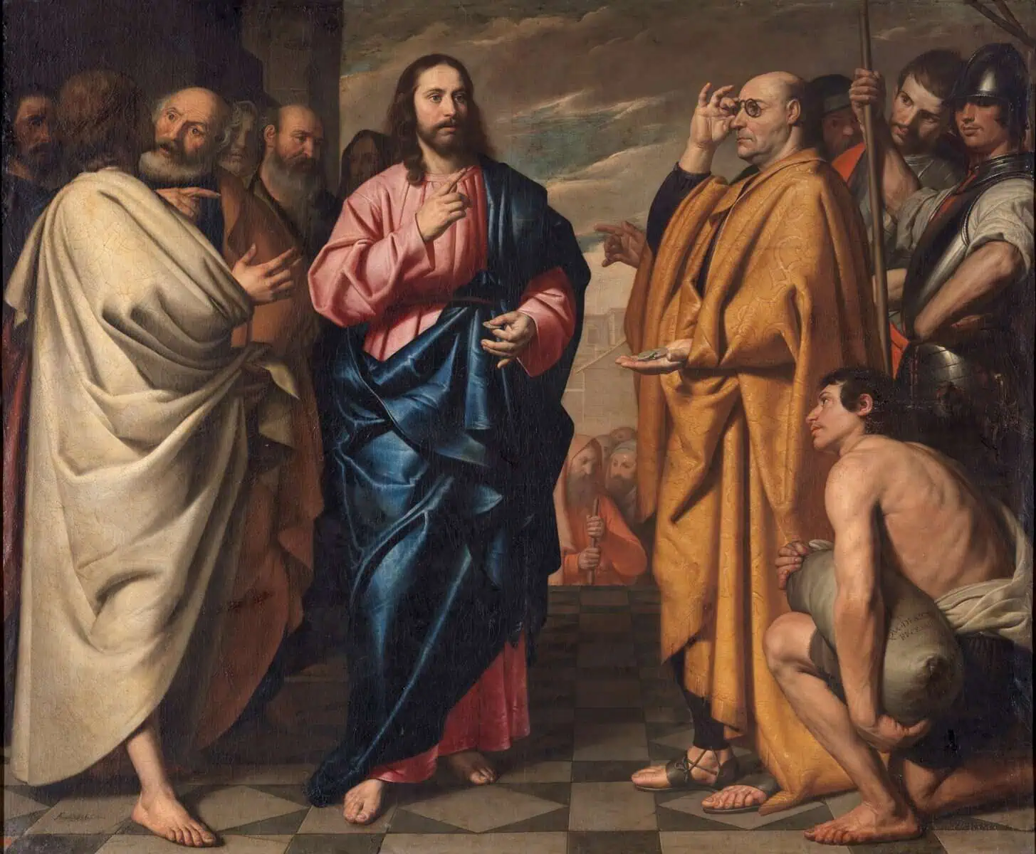 Otra de las narraciones relacionadas se refiere a la historia bíblica descrita en el evangelio de Mateo. Se relata que Jesús llega a Caparnaum y pregunta por el cobro de impuestos (pues se tenían que pagar dos dracmas). Jesús envía a Pedro a lanzar su red al mar y, en el primer pez que cache, encontrará esta moneda griega hecha de plata y oro. De esta manera, en la pintura de Jacob Jordaens se muestra la embarcación acomodando las velas o pescando y, del lado derecho, San Pedro saca lo que parecen ser muchas más de una sola dracma de la boca de un gran pescado.