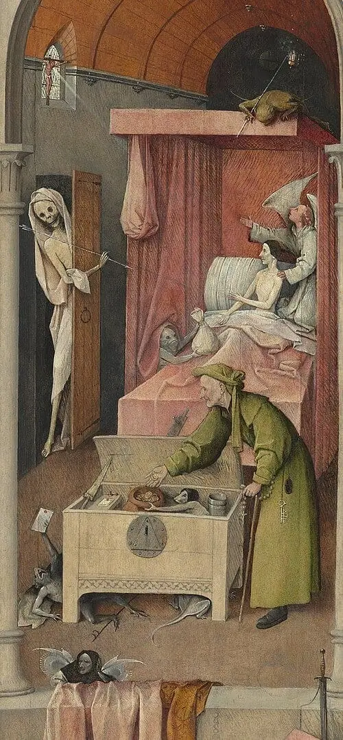 Pero la que mejor representa al conjunto es la obra del Bosco “La muerte y el avaro”. En ella, se encuentra el avaro en su lecho de muerte. Frente a él, un ser peculiar le entrega una bolsa de dinero. La muerte, detrás de la puerta espera a lanzar su flecha que le dé el último suspiro de vida al avaro. Un ángel lo sostiene por detrás, pidiéndole que mire al crucifijo de la ventana, que le lanza directamente un rayo de luz divina. Así, se enfrenta al bien y al mal, en su decisión por tomar la bolsa de dinero o encomendarse al ángel que lo ayuda. Debajo, se ven diferentes demonios en forma de rata, en lo que se supone es una escena pasada en la vida del avaro. Se cuenta su seducción por Mammón (la personificación de la avaricia en un demonio), cuyos demonios se posan en su cuarto y le ayudan en sus actividades.