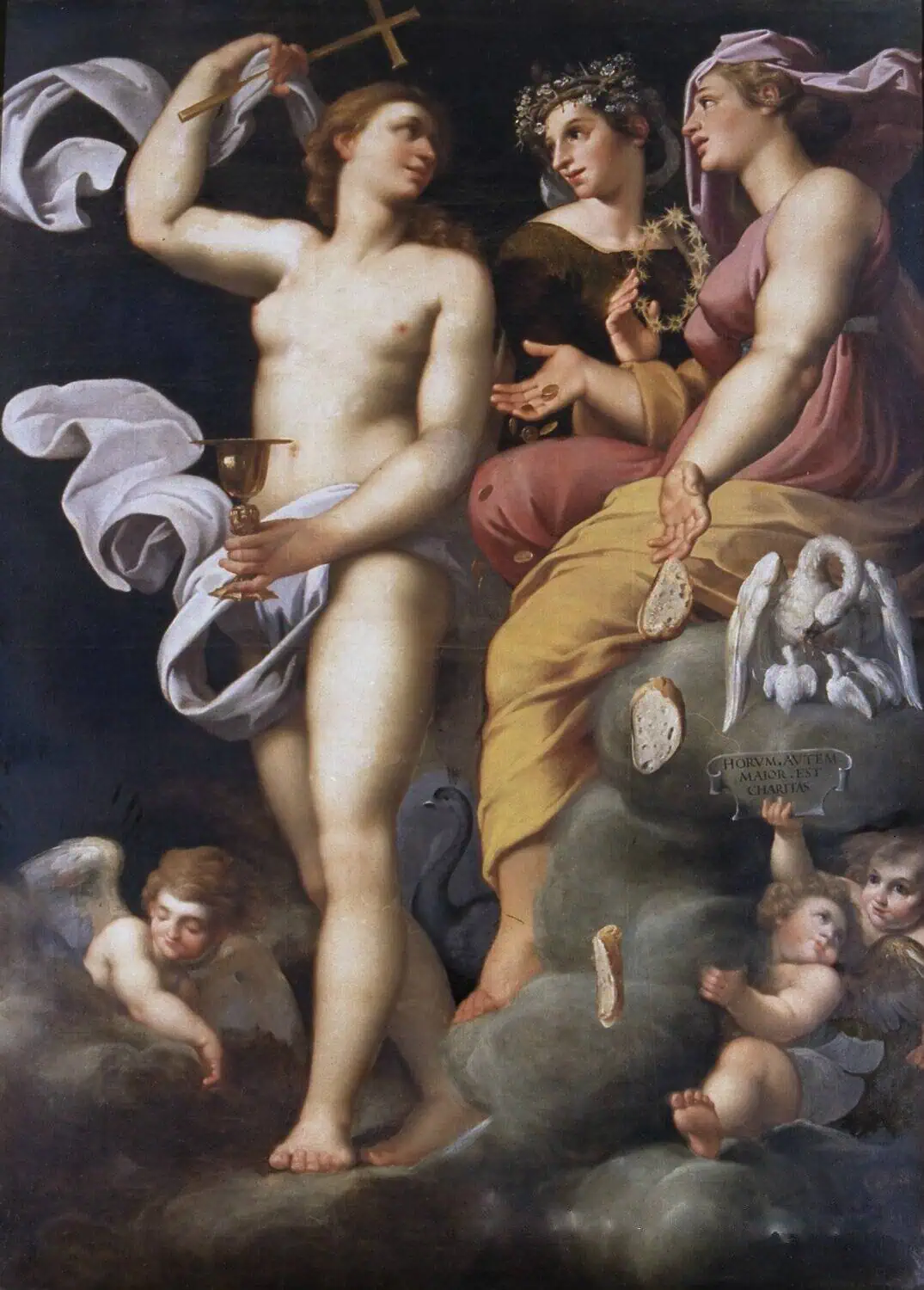 Por otro lado, las alegorías de la justicia y las virtudes contienen monedas. En la pintura de Giorgio Vasari se ve a la justicia sosteniendo una corona. En la parte de abajo está la representación de la corrupción y sus “deseos”, entre ellos hay monedas, joyas y vasijas. La corrupción está en una posición abatida y encadenada a la falda de la justicia. Por parte de las virtudes teologales, obra de Carracci, se observa a las representaciones de la fe, la esperanza y la caridad. La caridad derrama, de sus propias manos, pan y moneda. Precisamente indica la idea del amor desinteresado hacia los demás, compartiendo las riquezas y la comida.