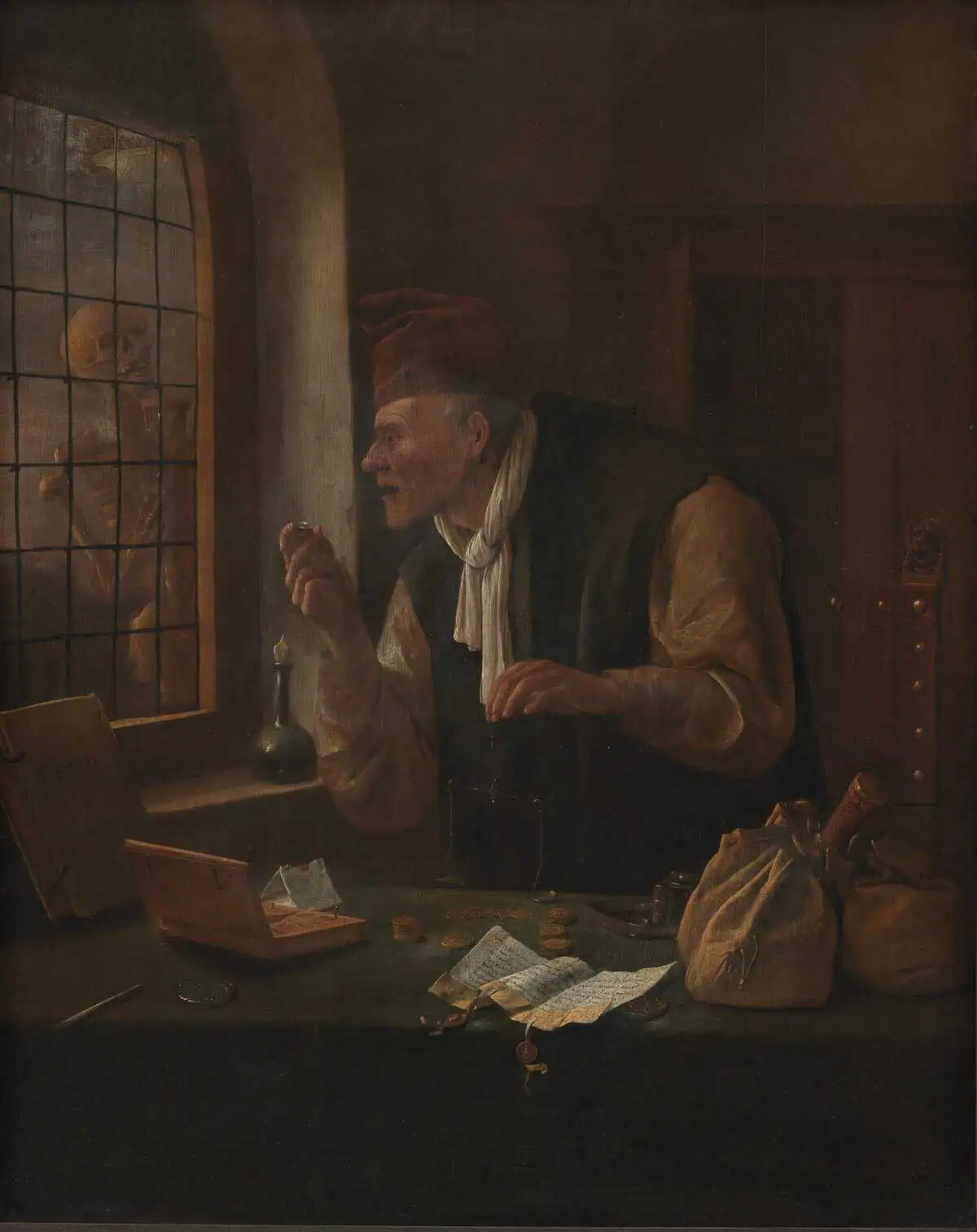 Por otro lado, se encuentran las alegorías a la avaricia y la codicia. En ellas se retrata a personas que, en la soledad de su escritorio y su vela, cuentan su dinero anhelando conservarlo y crecerlo. Es interesante que, en muchas de ellas, aparece una representación del mal o la muerte, como en el caso del esqueleto que se asoma por la ventana del avaro y le recuerda (con reloj en mano) que tiene poco tiempo y no debe desperdiciarlo en bienes fútiles. También está el caso de la mujer que pesa sus monedas y, detrás de ella, un demonio con forma de puerco se escabulle.
