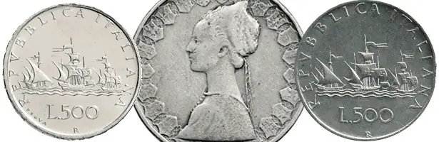 Las famosas 500 liras de plata conocidas como carabelas, por las tres naves colombinas representadas en el reverso, han circulado ampliamente y al parecer no tienen nada de particular. Pero lo cierto es que se trata de una moneda única y muy discutida. Suscitó, en efecto, un pequeño escándalo por la disposición de los gallardetes de las carabelas del reverso.
