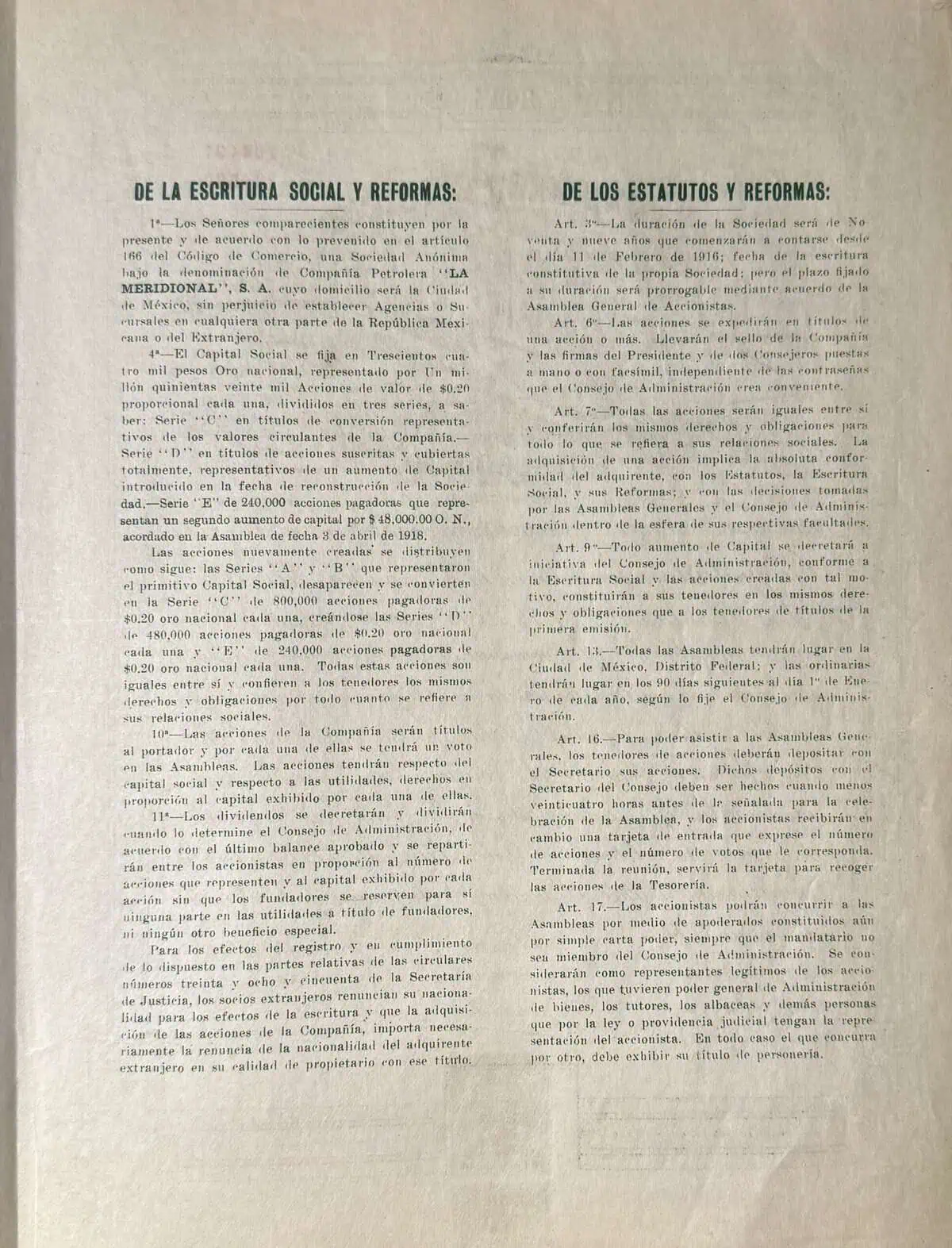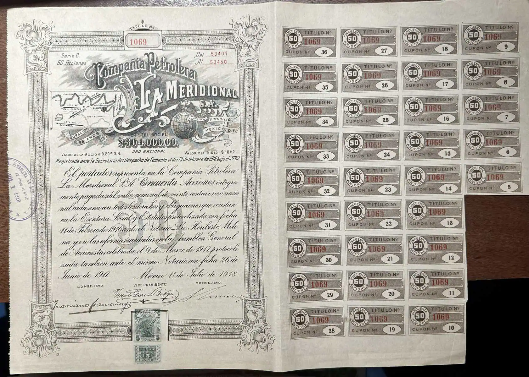 Acción 20 pesos Petrolera La Meridional Veracruz 1918