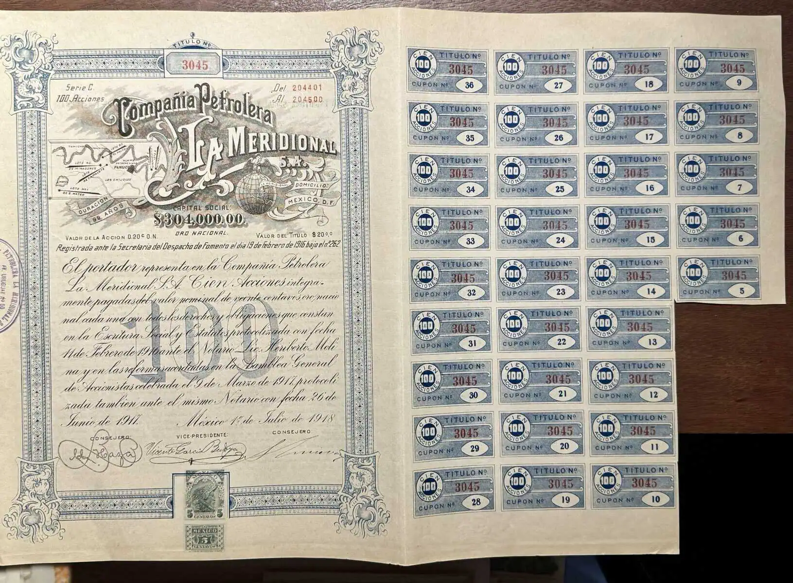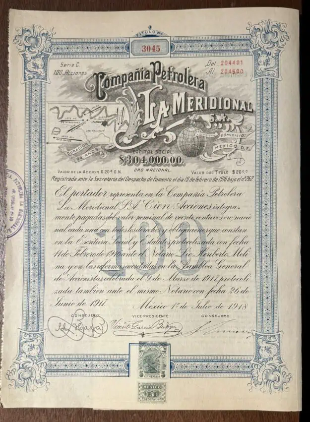 Acción 10 pesos Petrolera La Meridional Veracruz 1918