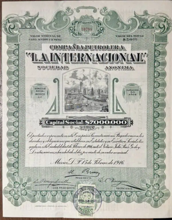 Acción 20 pesos Márgenes del Pánuco Veracruz 1917