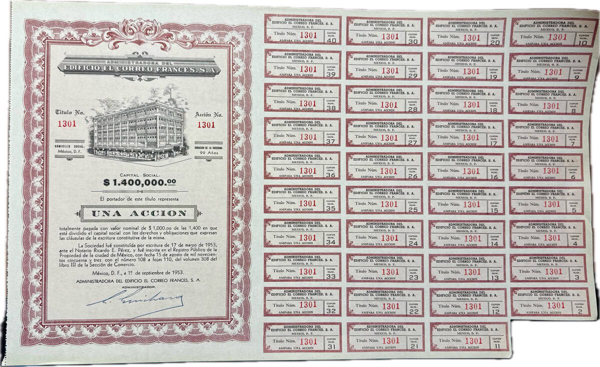 México 1 Accion 1000 Pesos Edificio El Correo Frances 1953
