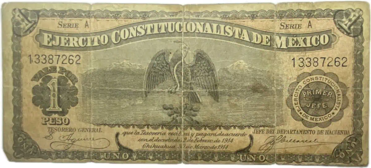 Mexico. 1 peso. 1914. Ejercito Constitucionalista de Mexico. marcas en horizontal y vertical, perforación al centro