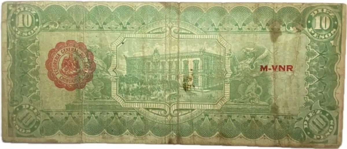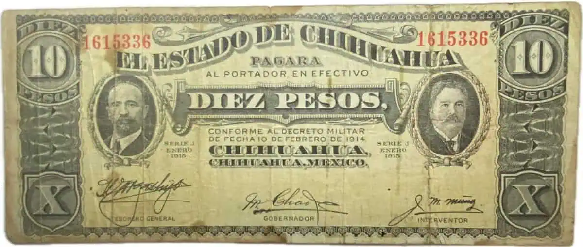 Mexico. 10 pesos. 1915. El estado de Chihuahua. marcas verticales, manchado ligero.Completo.
