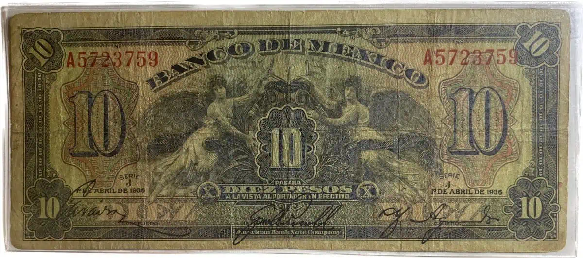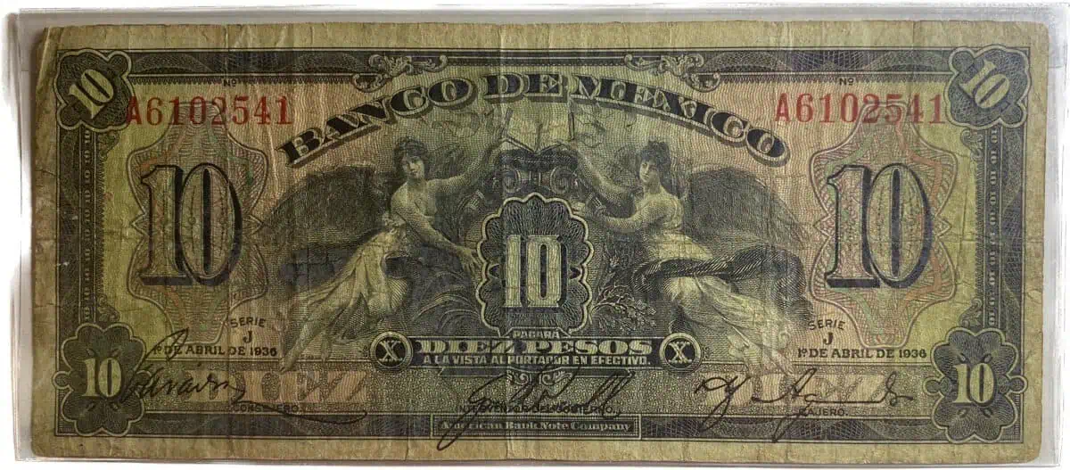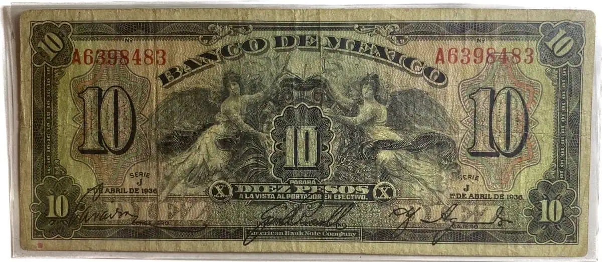 Mexico. 10 pesos.1936. billete de Banco de Mexico. Serie J. Formato angosto. con tres firmas. Calidad buena. Se asignara de forma aleatoria el numero de serie/artículo a entregar. Limitado a un artículo por cliente por compra