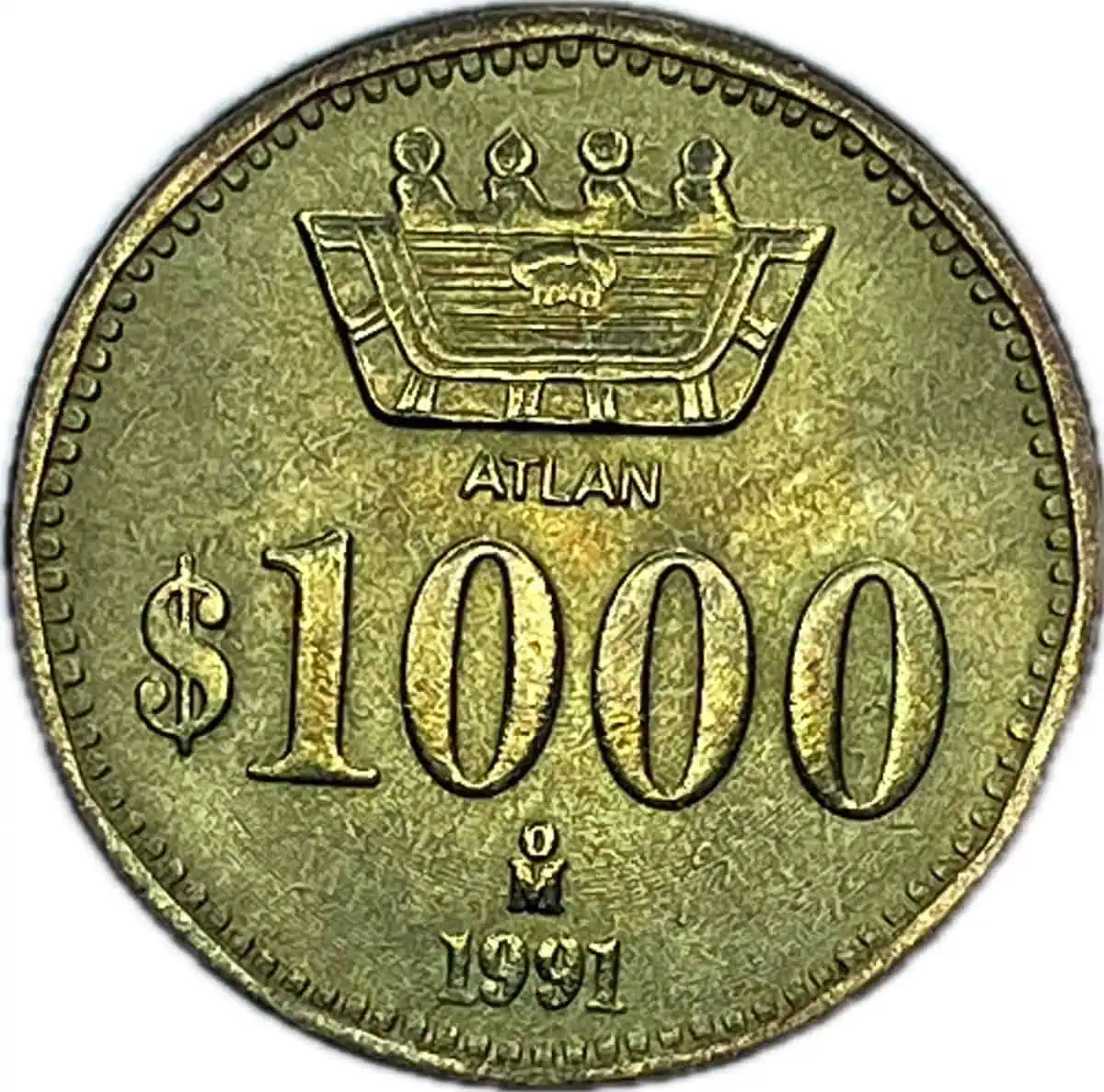 Mexico. 1000 pesos. 1991. Atlán. Moneda que no salio a circulación por la transición a nuevos pesos de 1992. buena condición y brillo. 12 mm de diámetro.