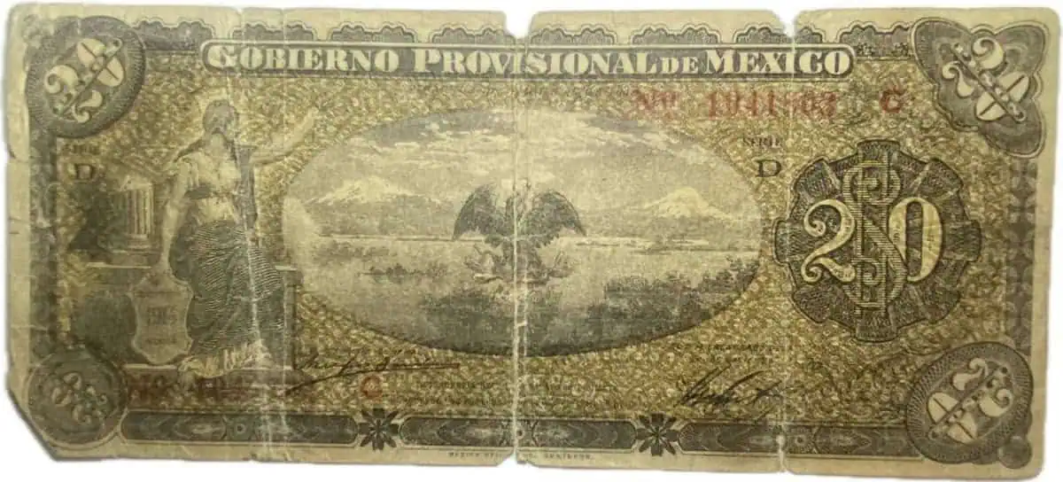 Mexico. 20 pesos. 1914. Gobierno provisional de Mexico. Serie D. marca central vertical muy marcada, roto de la mitad hacia abajo del doblez central.