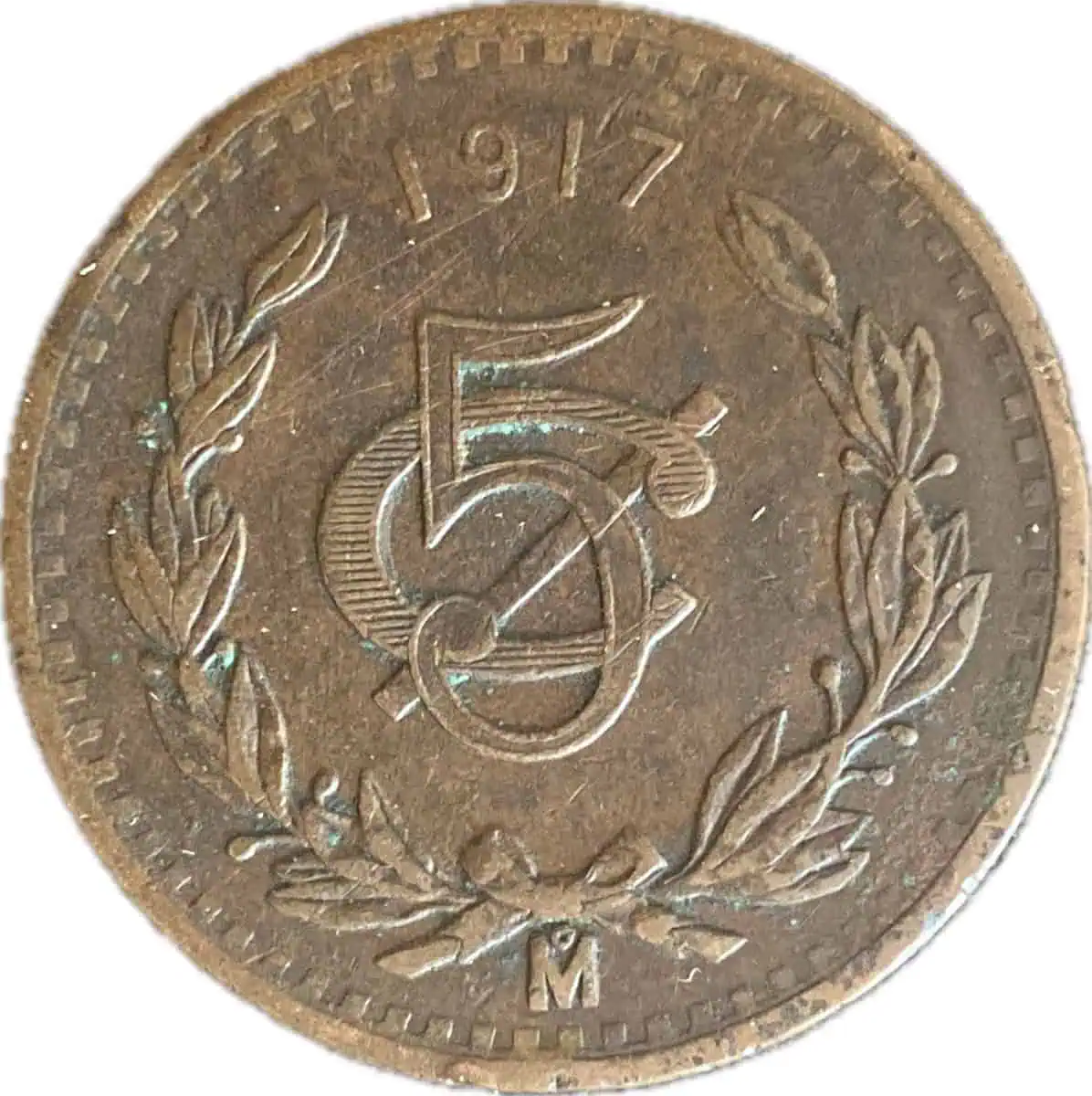 Mexico. 5 centavos. 1917. Patina obscura. Fecha clave. Monograma