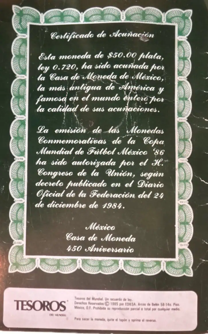 Mexico. 50 pesos.1986. Moneda mundialista Mexico 1986. Plata 0,720. En buena condición general. En blister original con detalles.