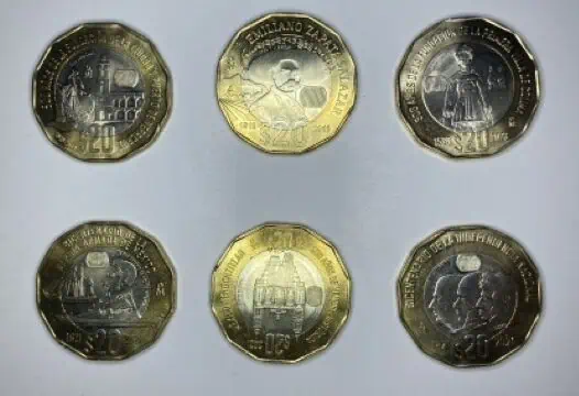 Conjunto de seis monedas de veinte pesos dodecagonales de diferentes años. El conjunto incluye las siguientes monedas: