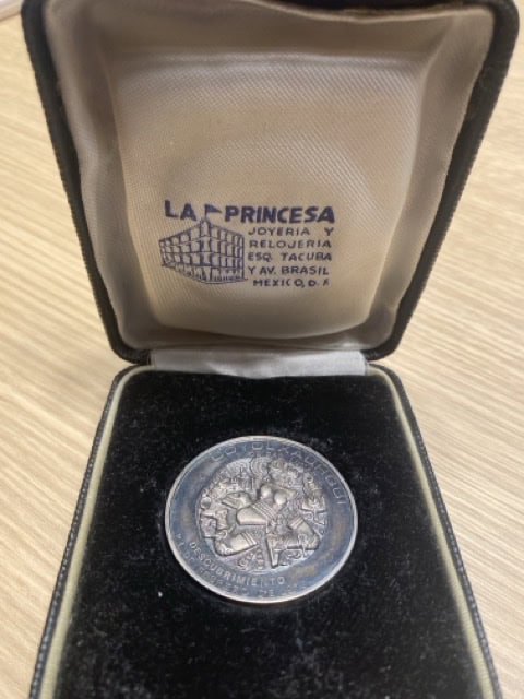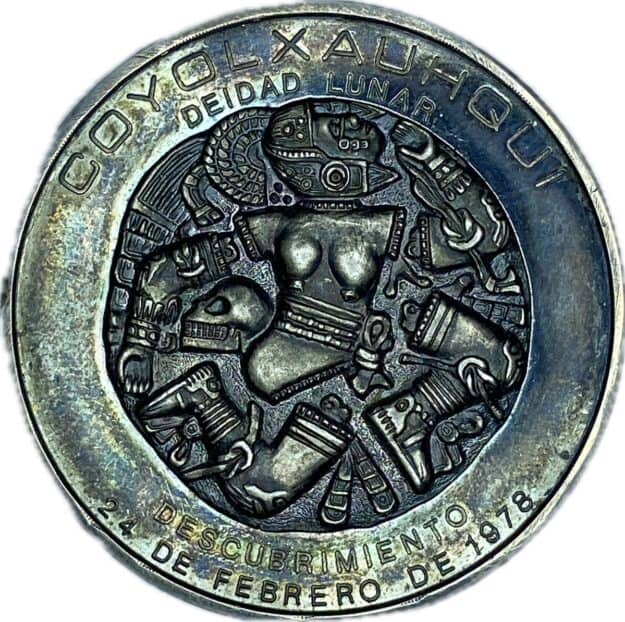 Medalla conmemorativa del descubrimiento de la Coyolxauhqui en la Ciduad de México. Plata. En estuche de la joyeria “La Princesa”.